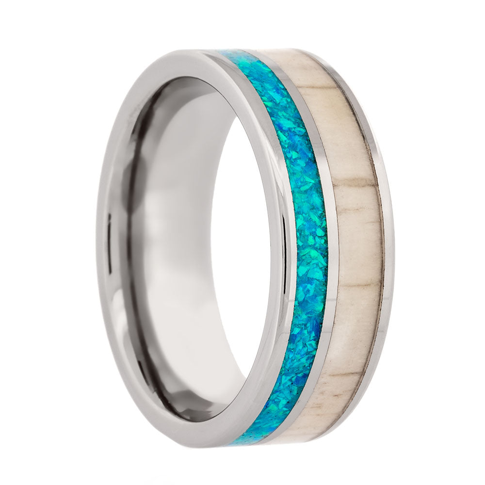 Looking for a wedding ring that's truly unique? Look no further than our asymmetrical deer antler and blue opal men's cobalt wedding band! This ring is perfect for any man looking to make a statement with his wedding band. Made from high-quality cobalt, this ring is built to last a lifetime. And with our lifetime warranty, you can be sure that your ring will be protected from damage or size exchanges for as long as you own it. But it's not just the durability that makes this ring special. The asymmetrical deer antler and blue opal inlay add a touch of rustic charm that's perfect for the outdoorsman or nature lover in your life. And the cobalt band provides a sleek and modern contrast to the natural materials. Whether you're buying for yourself or as a gift, this ring is sure to impress. So don't settle for a boring wedding band – choose the asymmetrical deer antler and blue opal men's cobalt wedding band and make a statement that will last a lifetime.
