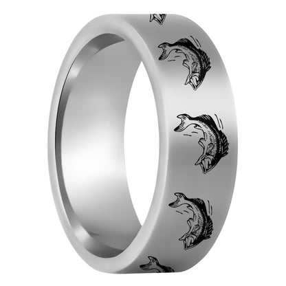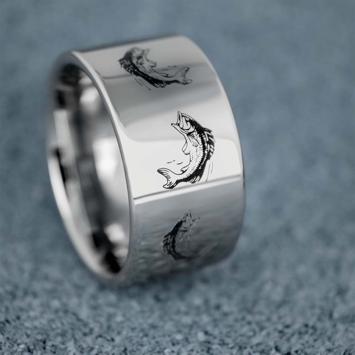 A school of leaping Bass forever playfully circle around your ring with an effortless ease. Sleek, shiny and strong this tungsten carbide metal wedding band will feel great on your hand. The carefully crafted flat top of the band easing over to the flat sides will not interfere with your daily activities whether work or play. If you find yourself relaxed and contemplative in nature or fishing, this ring will carry you through life and marriage in much the same way. Bring your twin loves together; wild nature and your partner in life.