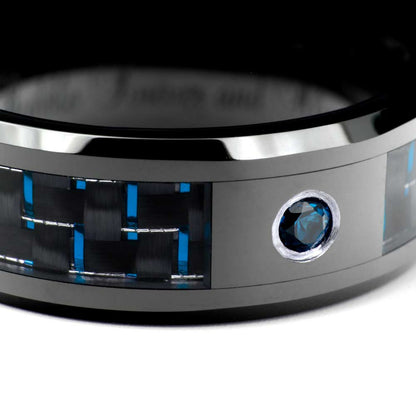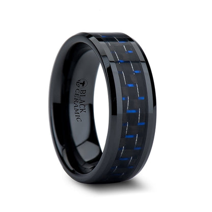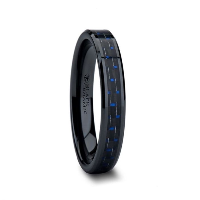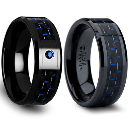 Black & Blue Carbon Fiber Inlaid Black Ceramic Couple's Matching Wedding Band Set