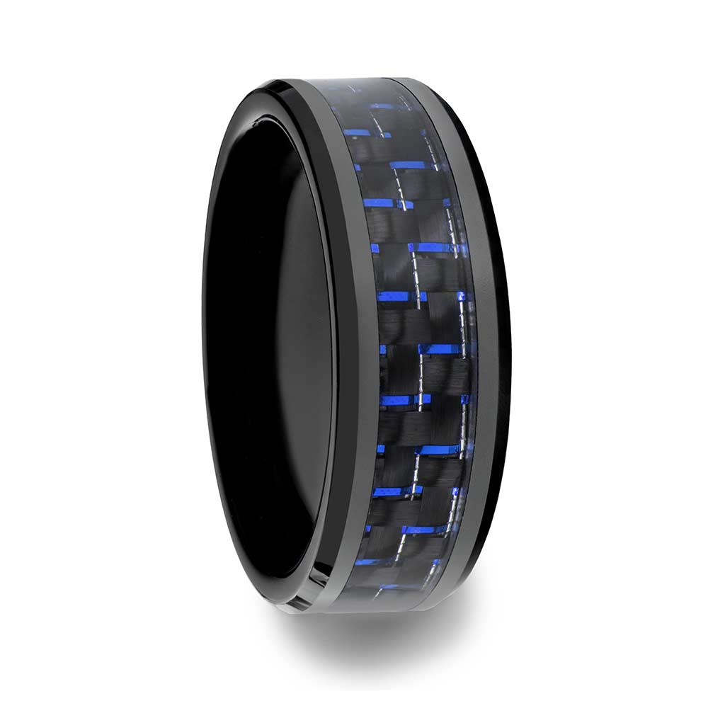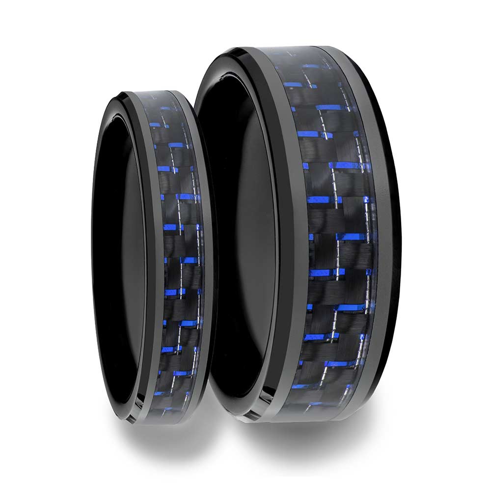 Black & Blue Carbon Fiber Inlaid Ceramic Couple's Matching Wedding Band Set