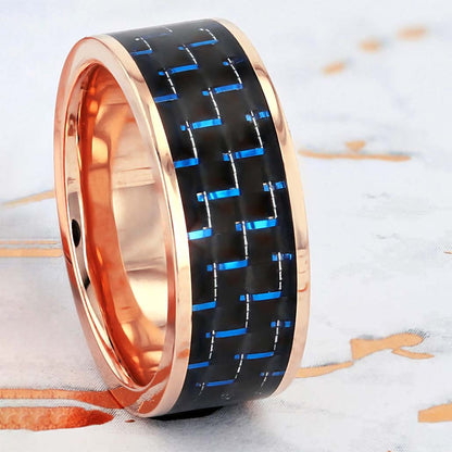 A man who does not conform to fading trends will truly connect with this wedding band. This gleaming polished rose gold and black and blue carbon fiber inlaid ring will instantly catch the eyes of those around you and hold all their attention. It is a piece that will stand out on your wedding day and in years to come. Very few rings embellish the hand with as much flair as this fabulous piece. Its ageless lure and pure robust elegance places this band among the greats of wedding rings. The flat surface of the ring is dignified, bestowing character to the ring as well as the wearer.