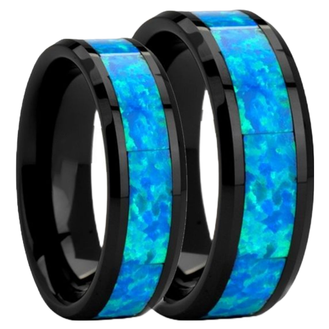 Black ceramic Couple's Matching Wedding Band Set with Blue & Green Opal Inlay Details