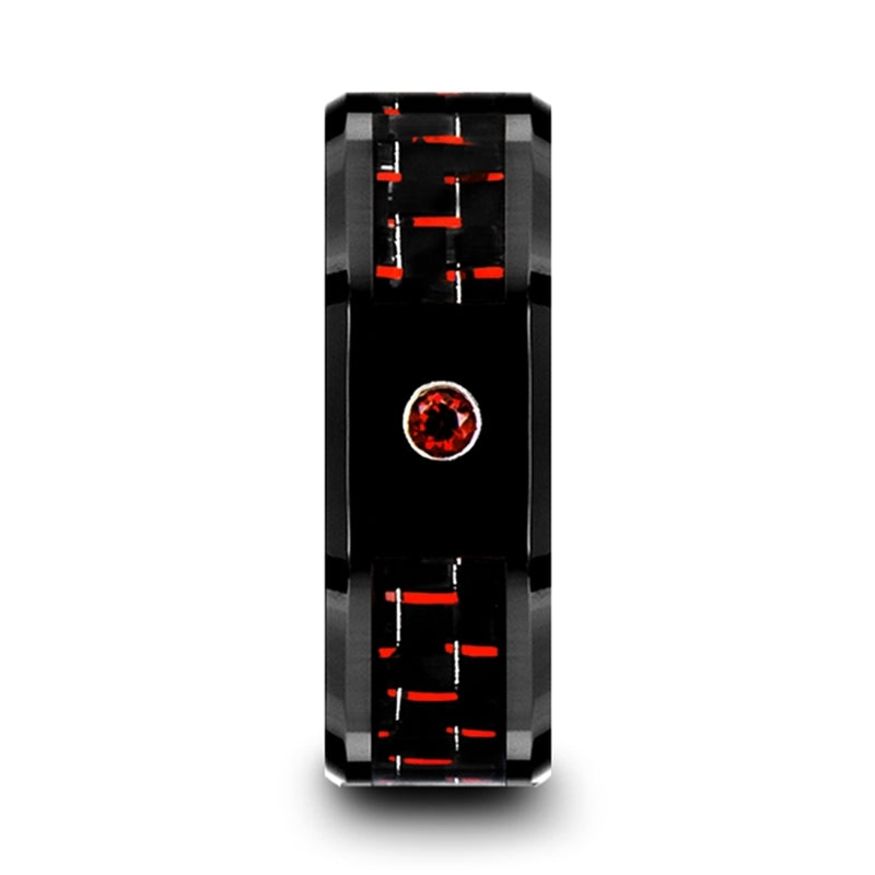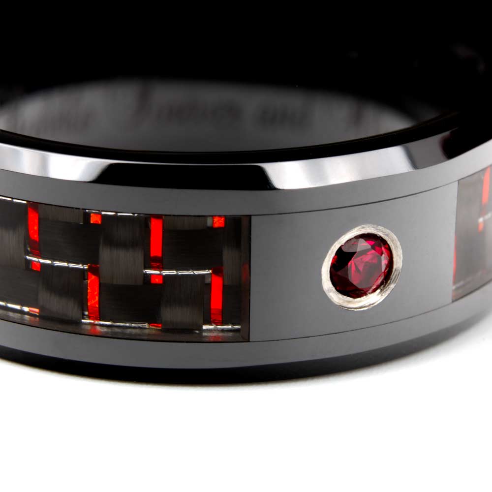 Black Ceramic Men's Wedding Band with Black & Red Carbon Fiber Inlay and Ruby