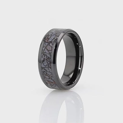 In all seriousness, this ring is so cool. It looks unlike anything I’ve ever seen. The dinosaur bone looks like camouflage and set against the black really makes it pop. Both of us love this ring, so does everyone that sees it. Very pleased with the craftsmanship. He is proud to be wearing it.