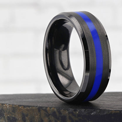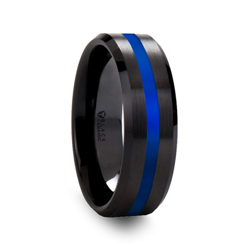 Black Ceramic Men's Wedding Band with Blue Stripe