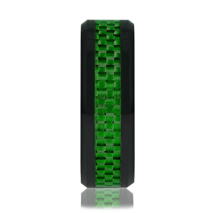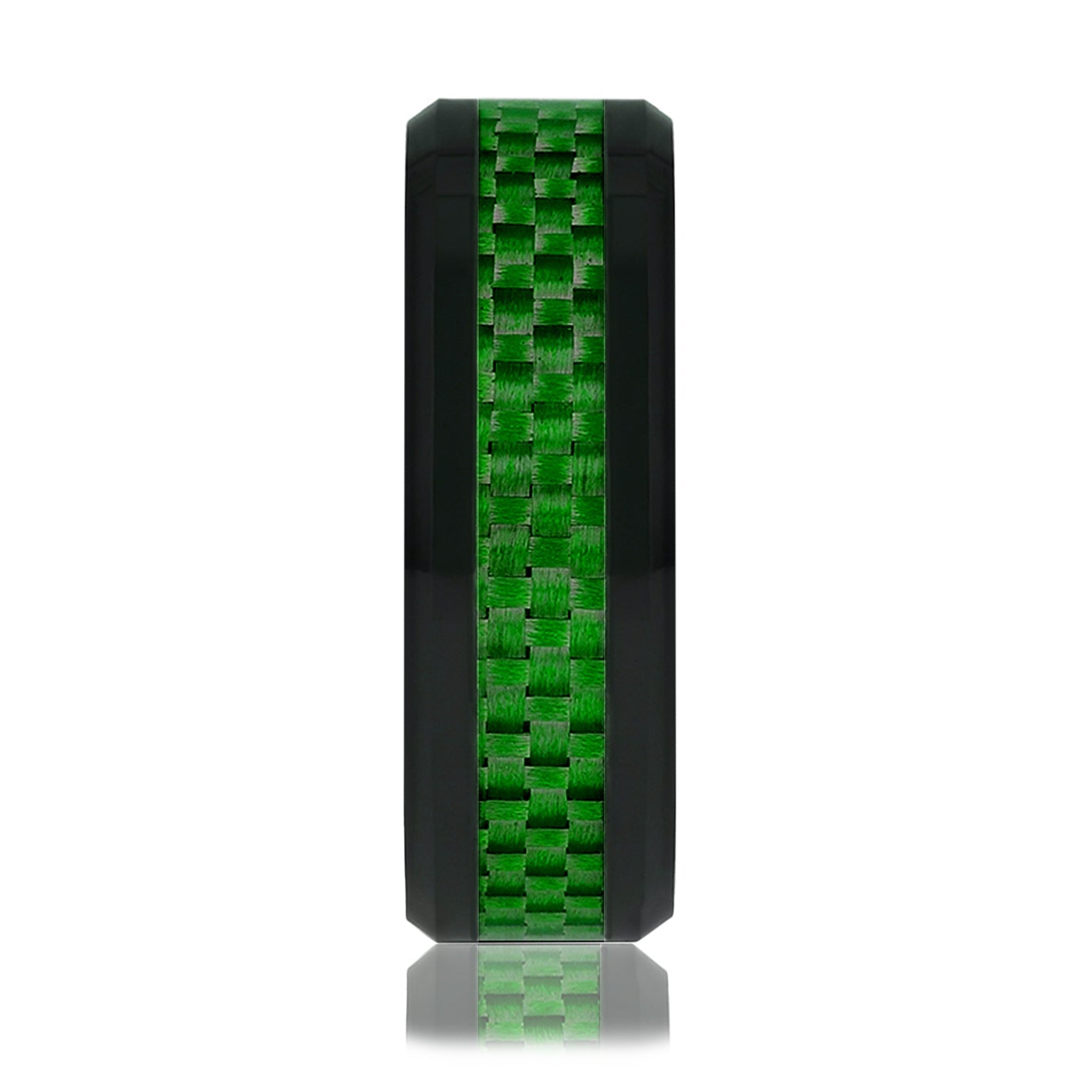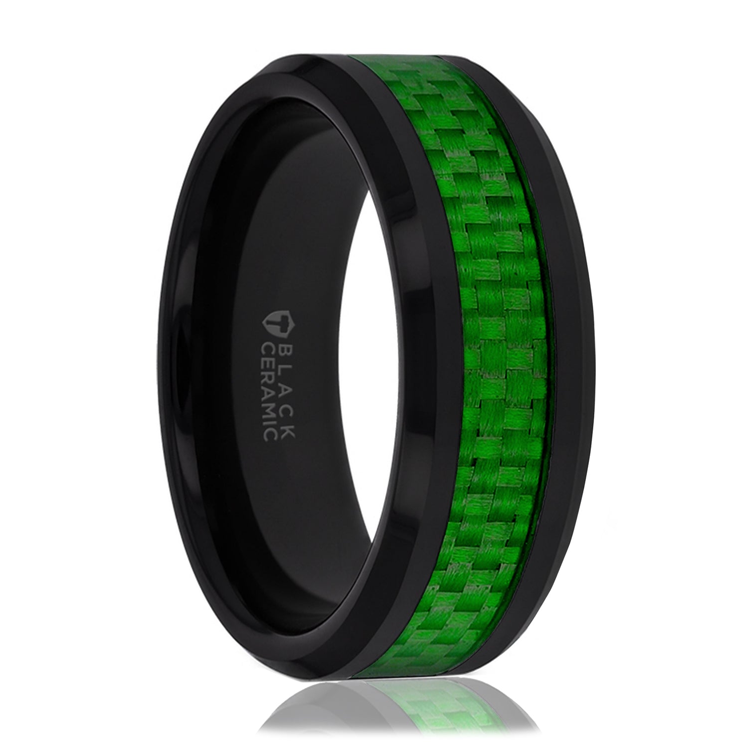 Dive into the deep weave of this wondrous piece. It elegantly braids the tapestry of union and strength binding it to the man and woman whose love it represents. The Emerald green carbon fiber inlay suggests a depth of strength and reliance that allows your pieces to fall together only to become more empowered and at peace. It is surrounded and rooted in the Flame fortified black ceramic band. Two perfect substances coming together to create something bold, unique and fierce. A proud symbol of the one you've decided you simply cannot live without. Down to it's beveled edges may it signify the ease with which you face adversity and life challenges, because together, you've become unstoppable.