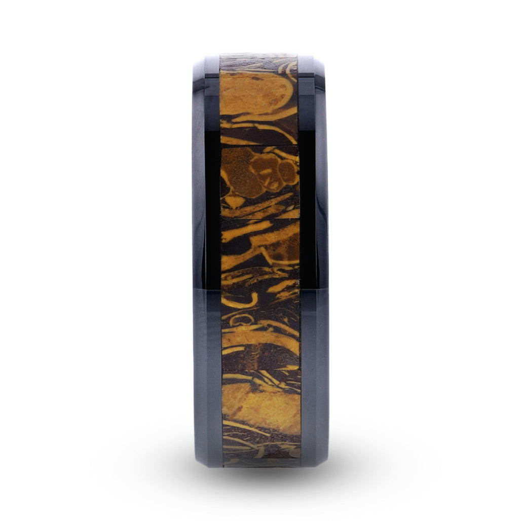 Black Ceramic Men's Wedding Band with Sanskrit Stone Inlay
