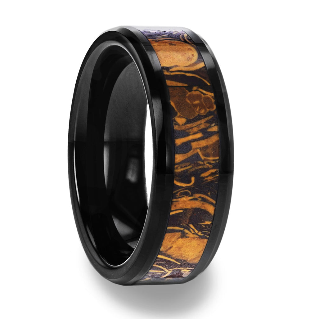 Dare to be bold with this stunning black ceramic wedding band that features a Sanskrit stone inlay. Rich in color, the inlay sports a natural and effortless pattern that perfectly complements the ceramic. Black ceramic is very durable and symbolizes the strength of your union. This ring is the ultimate expression of your commitment and delivers a modern twist to a classic style. Your love story is unique. And so, the wedding ring you choose should also be as one-of-a-kind as your relationship. This exquisite piece is remarkable, stylish, and everything you could ever want in a dream wedding band. Ceramic is not easy to break. It's also super resistant to scratches, nicks, and imperfections. The inside of the ring's shank is rounded for comfort, making it a real joy to wear it daily. This band is a chic alternative to traditional gold and silver rings and will retain its appeal even in decades to come.