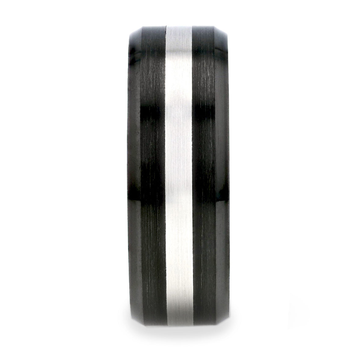 This piece is set in black ceramic with a tungsten carbide inlay that traverses the center of the entire band. This sensational feature adds an auxiliary facet to the piece which is accentuated by its beveled edges. A shimmering stripe of tungsten flashes like a firebolt across the dark sky of a beaming black ceramic ring. This piece is faceted to maximize on the light shining on it. With this wedding ring, you are guaranteed to amaze many with such a unique choice. And it does so in a wantonly emphatic manner. This artistic piece has a pattern that is minimal, modern and unforgettable. This sleek and stylish ring doesn't just look good, it feels amazing on your finger too. Made with high-quality materials, it's scratch-resistant and designed to last a lifetime. Say goodbye to boring and predictable wedding bands, and say hello to the perfect match for your unique style. The tungsten inlay adds a touch of masculinity and toughness to the ring, while the black ceramic gives it a modern and sophisticated look. Whether you're a traditionalist or a trendsetter, this ring suits any groom-to-be who wants to look his best on the big day. But we don't just stop at style - we also offer a lifetime warranty. Whether you need a size exchange or your ring needs repairing, we've got you covered. You can trust that your ring will remain as beautiful and meaningful as the day you first slipped it on. Give the gift of a lifetime with this black ceramic men's wedding band with tungsten inlay. It's the perfect way to show your commitment to your partner and celebrate the start of your forever.