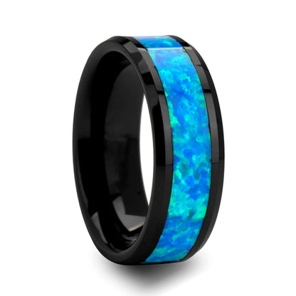 Black Ceramic Wedding Band with Blue & Green Opal Inlay
