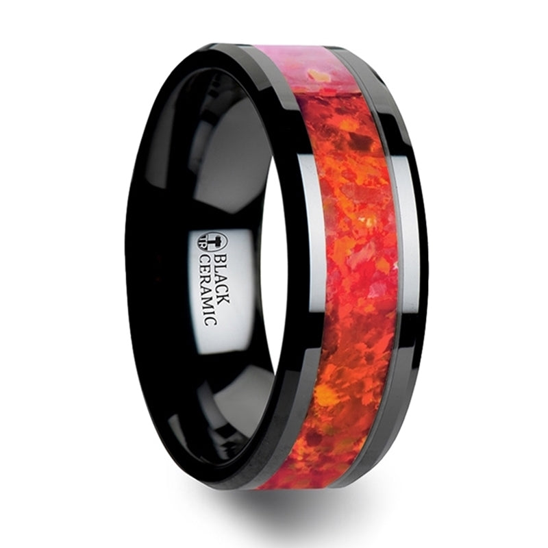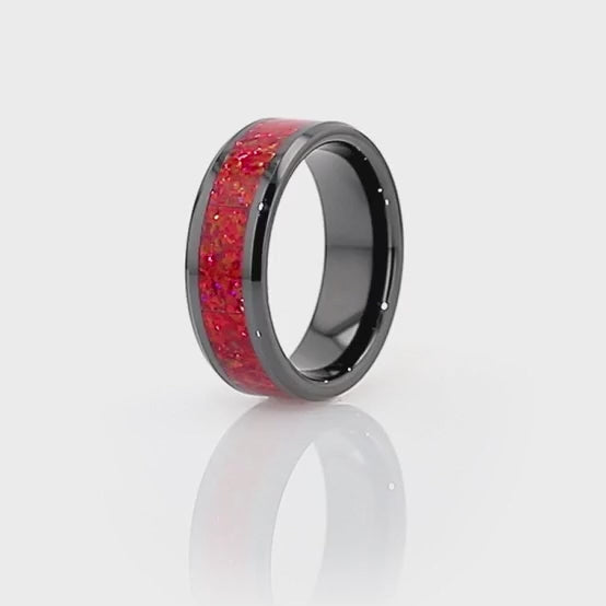 Black Ceramic Men's Wedding Band with Red Opal Inlay