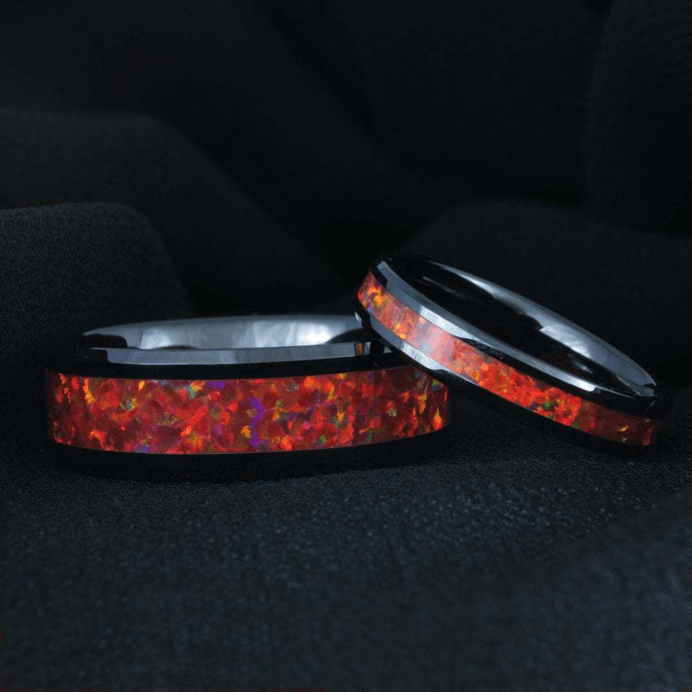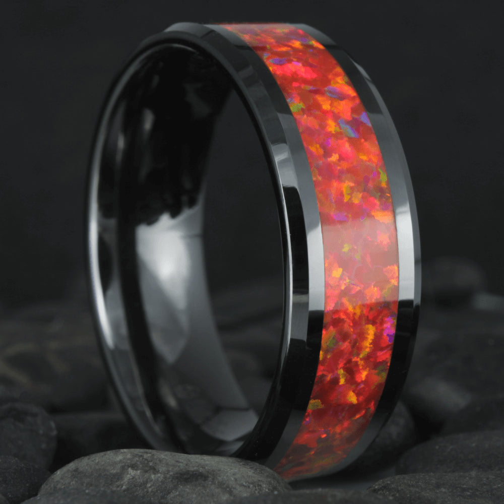 Want to add a touch of sophistication to your wedding band? Look no further than this stunning black ceramic wedding band with a striking red opal inlay. The unique design symbolizes the vows you share with your soulmate. It's a timeless and meaningful way to show your love and commitment. So why settle for a plain, boring band when you can have a bold and beautiful one? With its sleek black ceramic band and fiery red opal inlay, this wedding band is sure to be a conversation starter for years to come. Don't miss out on the chance to make your wedding day even more memorable with this stunning red opal inlay ring.