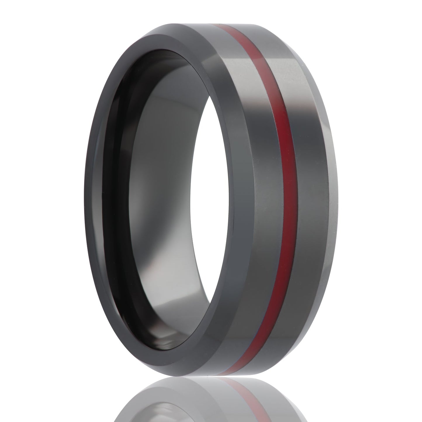 Black Ceramic Wedding Band with Red Groove & Beveled Edges