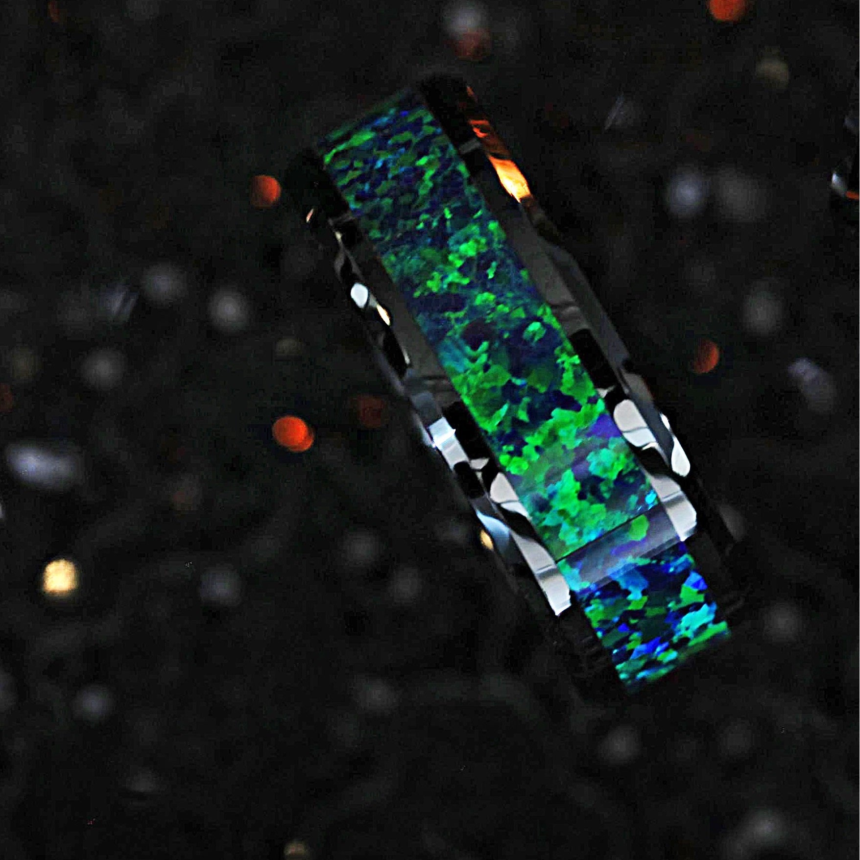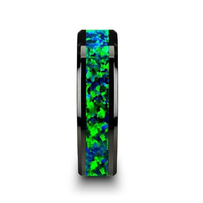 Black Ceramic Women's Wedding Band with Green & Blue Opal Inlay
