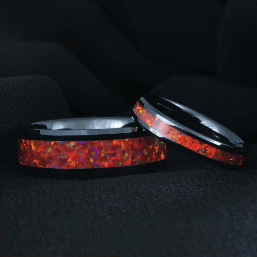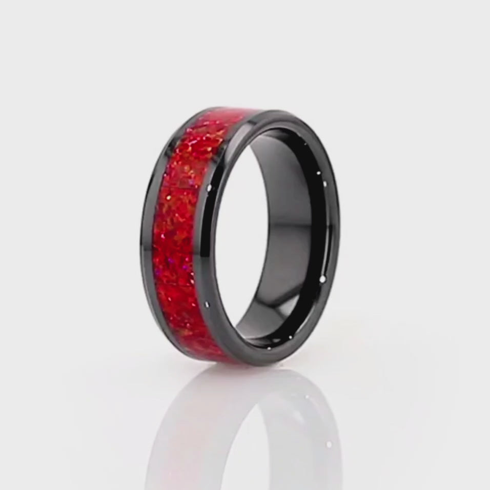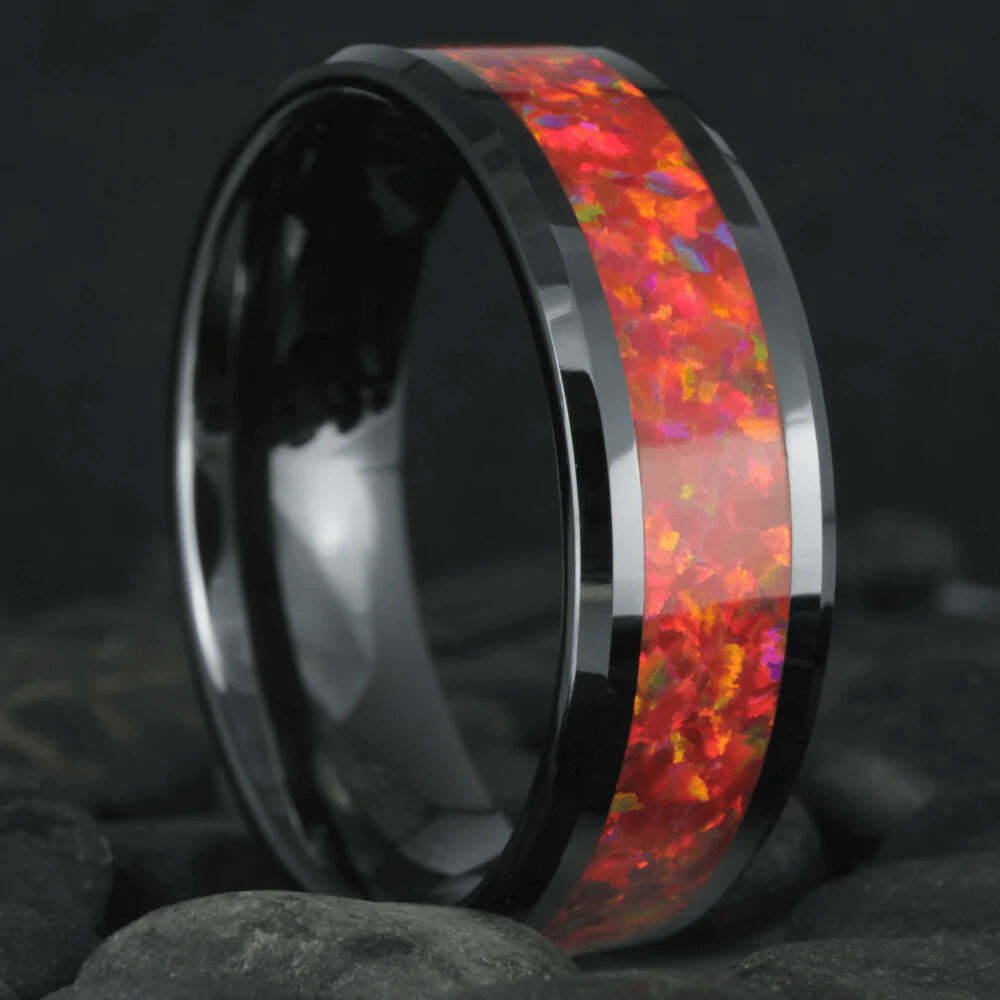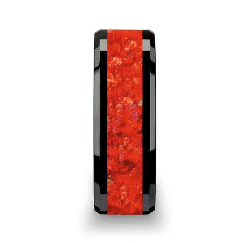 Red opal. The mother of all mysterious energy. The allure of the unknown. The collectiveness of all that excites, but intimidates as well. This description is starting to sound like marriage, isn't it? You want to get married, that's why you are here. But you do feel a certain kind of fear, and excitement. Anticipation. Here's the thing; the moment that anticipation and attraction dies, your marriage dies. This black ceramic wedding band with beveled edges and red opal inlay is a beautiful reminder that you need to keep finding the excitement and mystery in your partner. Never ever let the fire die out.