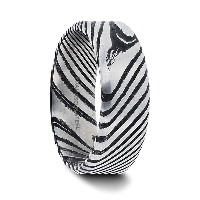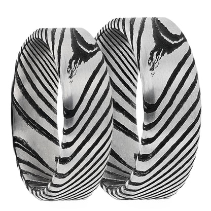 You will love the dimensional look of this beveled couple's wedding band set. This look is enhanced by the black and silver appearance, making it the ideal choice if you have been searching for a ring that's different from the rest. It's even more fitting if you want a striking piece to match your outfits. Made with Damascus steel, this is one of the strongest and most resilient matching wedding rings you'll ever find. It is also not as common as other wedding bands, which you'll love if you have a penchant for rare things. There's no better symbol of love than this one that can perfectly embody the unconditional love, undivided commitment, and immeasurable loyalty that you have for your betrothed. It's a proclamation of your willingness to move heaven and earth to provide your significant other with the finest things in life. Many years into your marriage, it'll remain undamaged and unbroken just like your bond.