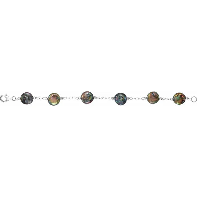 Hey there! Want to add some elegance to your look without spending hundreds? This black freshwater cultured coin pearl bracelet is just what you need! Made with high quality pearls, this bracelet is perfect for formal events or everyday wear. The unique coin shape of the pearls adds a modern twist to a classic piece of jewelry. The black color gives it an edgy vibe that will catch everyone's eye. This bracelet is perfect for gift giving too! Whether it's for your mom, sister, girlfriend or bestie, this bracelet will make them feel special and appreciated. It's a versatile piece that can be dressed up or down, making it a staple in anyone's jewelry collection. So why settle for boring and overpriced jewelry when you can have this beautiful pearl bracelet at an affordable price? Don't miss out on this opportunity to add a touch of class to your wardrobe.