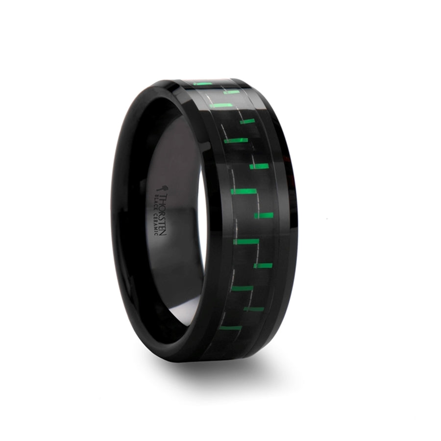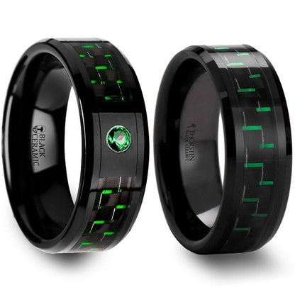 Black & Green Carbon Fiber Inlaid Black Ceramic Couple's Matching Wedding Band Set