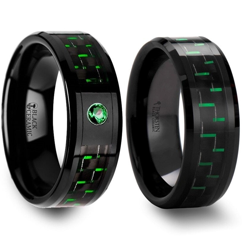 Introducing the ultimate symbol of love and unity: the black & green carbon fiber inlaid black ceramic couple's matching wedding band set! These rings are the perfect blend of style, durability, and affordability, making them a great choice for any couple looking to tie the knot in style. Crafted from premium quality black ceramic, these rings boast a sleek and modern design that will make heads turn. The black & green carbon fiber inlay adds a pop of color and texture, giving the rings a unique and edgy look. But don't let their stylish appearance fool you, these rings are built to last. With a lifetime warranty that covers damage and size exchanges, you can rest easy knowing your rings are protected for life. Not only are these rings scratch-resistant, but they are also hypoallergenic, making them perfect for those with sensitive skin. Don't settle for boring, overpriced wedding bands that break the bank. Get the black & green carbon fiber inlaid black ceramic couple's matching wedding band set and make a statement that's both stylish and affordable. Order now and make your big day even more special.