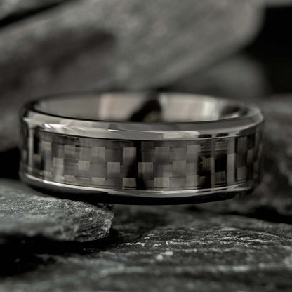 Black on black has always been a classic style that never goes out of style and exudes refinement that lasts a lifetime. Wear this all-black ring to make a statement. It's a terrific way to show off your uniqueness, sense of style, and, most importantly, your devotion. This ring's black carbon fiber inlay complements the polished edges giving it a more intricate appearance. It's the ideal accessory if you're looking for a fashionable wedding band that isn't overly flashy but still has a lot of value because it symbolizes your unique love and togetherness. This black titanium men's wedding band with a black carbon fiber inlay is the ideal option if you want a ring that stands out.