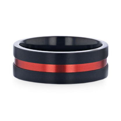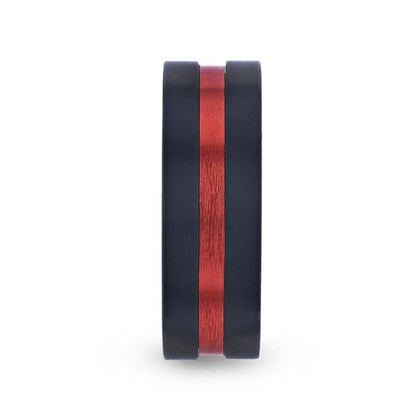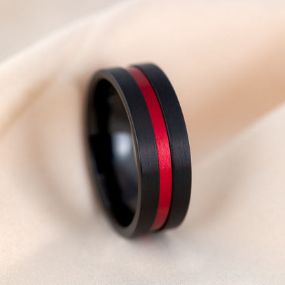Make a statement with this durable titanium wedding band for men. A stunning, rich red aluminum inlay graces the center of the ring. Black and red are a classic that never goes out of style. Perfect for the contemporary yet classy laidback guy with an eye for everything cool, this band is tasteful, full of pizzazz, timeless, and offers remarkable style. Light, easygoing, carefree totally describe the gentleman who would fall for this stunner. The ring is comfortable and easy to wear, thanks to its comfort-fit style. A wonderful wedding band and everyday ring, this piece allows you to celebrate your uniqueness and love for your significant other. If you prefer something lightweight and, at the same time, incredibly durable, this is it. The ring is built to withstand harsh environments because it’s forged from titanium. It looks awesome, not to mention it’s a tough nut to crack. What more could you ask for?