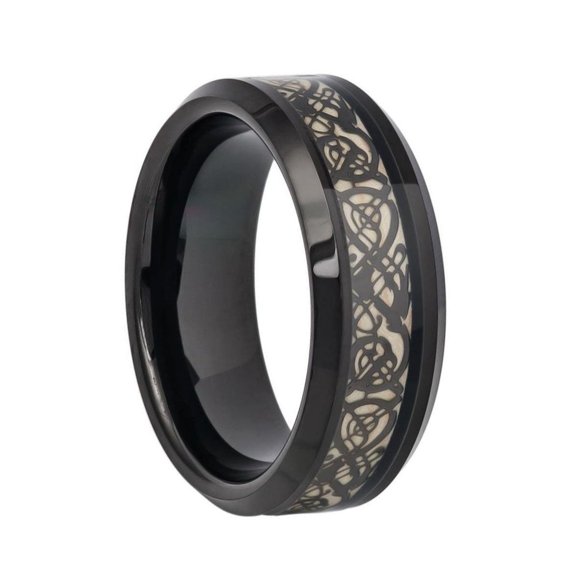 Get ready to slay the wedding game with our sleek Black Tungsten Men's Wedding Band with Celtic Dragon Inlay. No need to pay an arm and a leg for a quality wedding band - this baby is affordable and high-quality. The black tungsten metal is scratch-resistant, long-lasting, and are affordable. The Celtic dragon inlay adds a touch of personality and ruggedness to the classic wedding band look. This ring is perfect for the modern groom who wants to stand out without sacrificing style. It's masculine, durable, and unique - the perfect combination for any man's wedding day. Plus, this ring is so versatile that it can easily be worn as a fashion accessory after the wedding day. Gift it to your man and watch him light up with joy! Don't miss out on this must-have accessory for your special day. Order now.