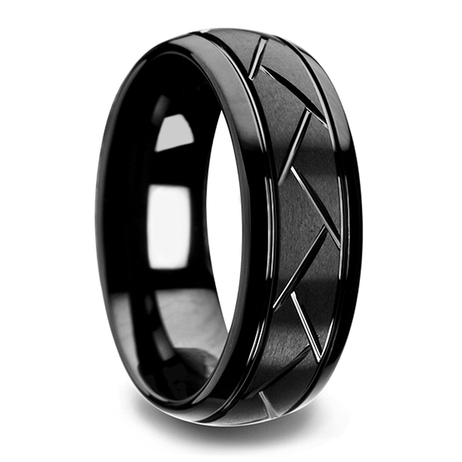 This ring combines a sleek black finish with an intricate diagonal cut pattern, distinguishing itself from the usual gold and diamond fare found at most jewelry stores. Whether a wedding band or promise ring, its bold and beautiful design is bound to attract attention, no matter the occasion. Choose from an abundance of size options from the comfort of your own home, and complete a matching set for you and your present or future spouse. Crafted from the best Tungsten carbide, this ring will not get scratched, worn down, or otherwise marred overtime, making it the perfect emblem of true, everlasting love.