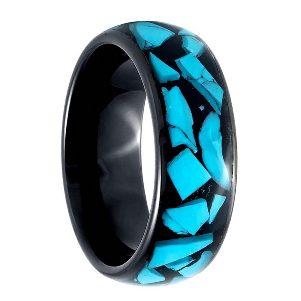 This black tungsten men's wedding band with turquoise inlay is the perfect combination of style and durability. Its unique design features a stunning turquoise inlay that will catch the eyes of anyone around. Whether you're getting married or just looking for a new accessory, this ring is sure to impress. Made with high-quality tungsten, this ring is scratch-resistant and will last for years to come. It's also hypoallergenic, making it a great option for those with sensitive skin. The black finish adds a sleek and modern touch, making it a versatile accessory that can be worn with anything. This ring makes a great gift for any special occasion, like a wedding, anniversary, or birthday. Its affordability means you don't have to overspend to give a high-quality gift that will be treasured for years to come. So why settle for a boring old ring when you can have this unique and stylish black tungsten men's wedding band with turquoise inlay? .