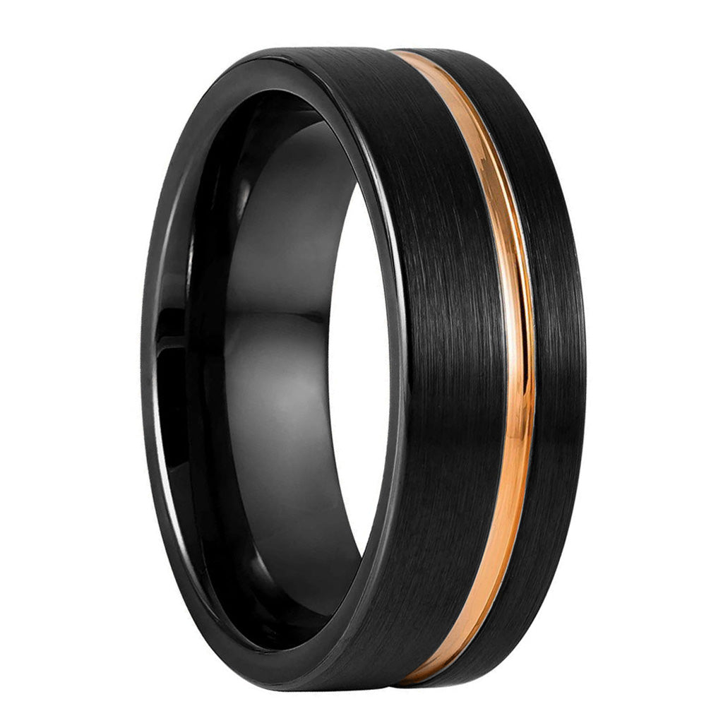Adorn your relationship with this stunning black tungsten men's wedding band, accented with a perfectly placed off-center rose gold groove. Complement a spouse's ring color with the rose gold, or let it stand on its own as a bold accent. This ring is the perfect way to show off your love while looking stylish and sophisticated. Crafted from the finest materials, this ring is as strong as your commitment to your partner. Tungsten is a highly durable metal that will withstand the test of time, making it the ideal choice for a wedding band. The asymmetrical groove adds a unique touch of elegance that will make you stand out from the crowd. The black color of the band exudes a sleek, modern look that will complement any outfit. Meanwhile, the rose gold groove is a stunning contrast that adds a touch of warmth and romance. The combination of these two colors is simply breathtaking. This ring is not only beautiful, but also comfortable to wear. The smooth finish and rounded edges ensure that your finger will remain comfortable throughout the day. Don't settle for a basic wedding band, choose one that truly reflects your style and personality. Our black tungsten women's wedding band with rose gold asymmetrical groove is the perfect choice for the modern, stylish bride.