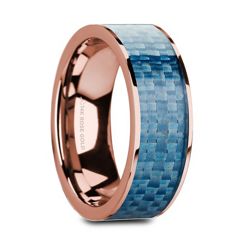 Intricacy of style and complex craftsmanship has been the prime concern in the forging of this band; an alluring and ever-inviting band of a rich, warm, 14k rose gold body, polished in a gloss to reflect, radiantly, vibrant lights and contrasting hues of motional play at the helm of a hand most vivacious in life and enduring love, and a complex and intriguing blue carbon fiber inlay, expertly weaved to create a look and feel of artisanal precision in design and fine art. With edges cut straight and at hard, shimmering angles, this band creates, more than anything, a true and steady statement in style and loving symbolism.
