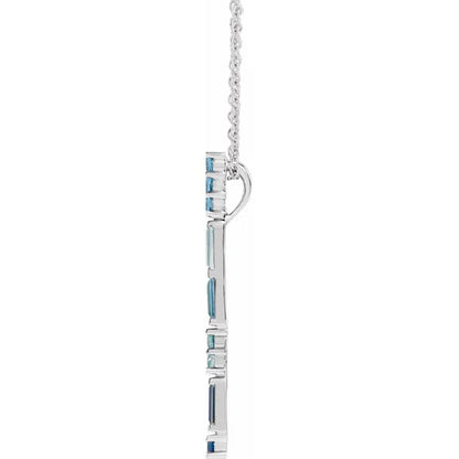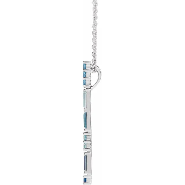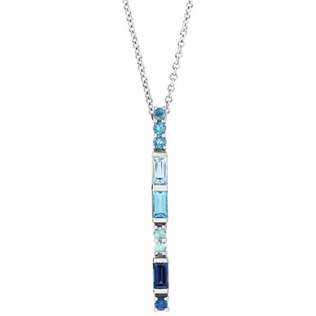 This blue gemstone ombre women's necklace is set in sterling silver and includes nine unique gemstones in hues of blue, including blue sapphires, swiss blue topaz, and round aqua.