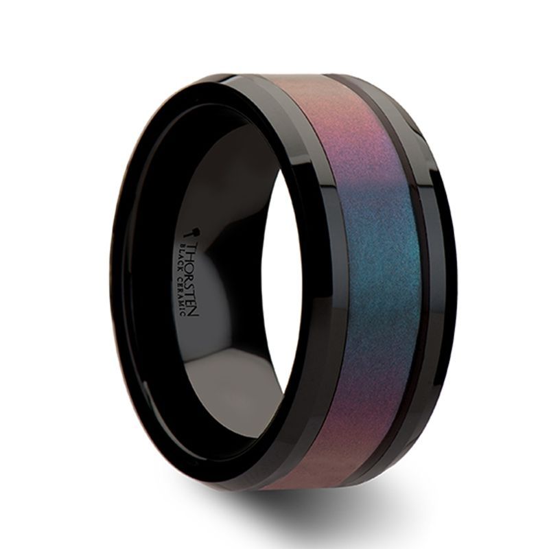 Blue & Purple Color Changing Inlay Black Ceramic Couple's Matching Wedding Band Set