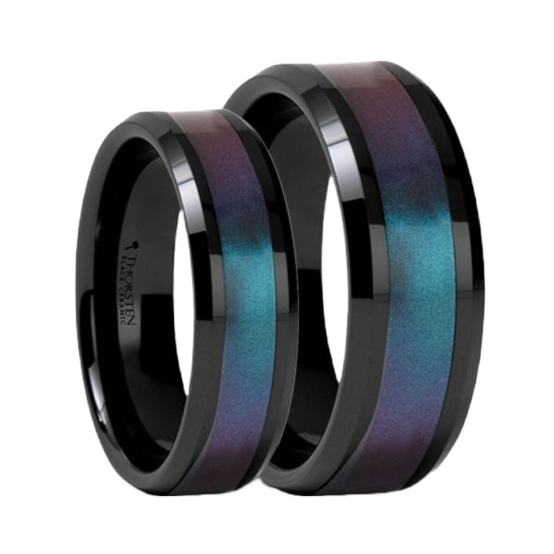 Perfectly matched blue-purple changing inlay black ceramic couple's wedding bands are included with this pair of rings. Handcrafted from black ceramic and finished with brushed. Ideal as a set of the wedding, couple's, promise, or travel rings. Made from high-quality, durable materials, these rings are perfect for couples who want a band that will last a lifetime while remaining affordable. Our rings come with a lifetime warranty that covers damage or resizing, which means you can wear them with confidence knowing that they'll always look great. The blue purple changing inlay adds a pop of color that's sure to turn heads, while the black ceramic base provides a sleek, modern look. But these rings aren't just about looks – they're also incredibly comfortable to wear, thanks to their lightweight design and smooth interior. Whether you're getting married or just looking for a unique accessory to wear, these rings are the perfect choice.