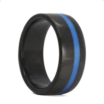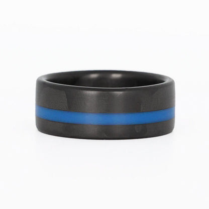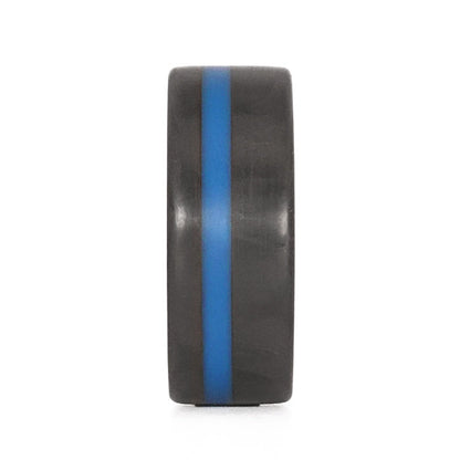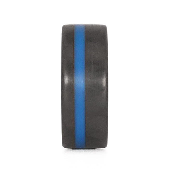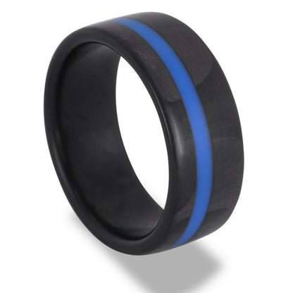 Made by hand in the USA, this carbon fiber men's wedding band is inlaid with a blue stripe. Perfect for the law enforcement officer who wants a thin blue line in his ring to symbolize his life's work, this ring is as tough as he is and built to last. This premium ring is designed for modern and stylish grooms who want something different than traditional bands. Made with high-quality carbon fiber, this ring offers the perfect combination of strength, durability, and comfort. It's super lightweight and hypoallergenic, meaning you can wear it all day and night without any irritation or discomfort. The bold blue stripe gives the ring a unique and eye-catching look that will surely turn heads.