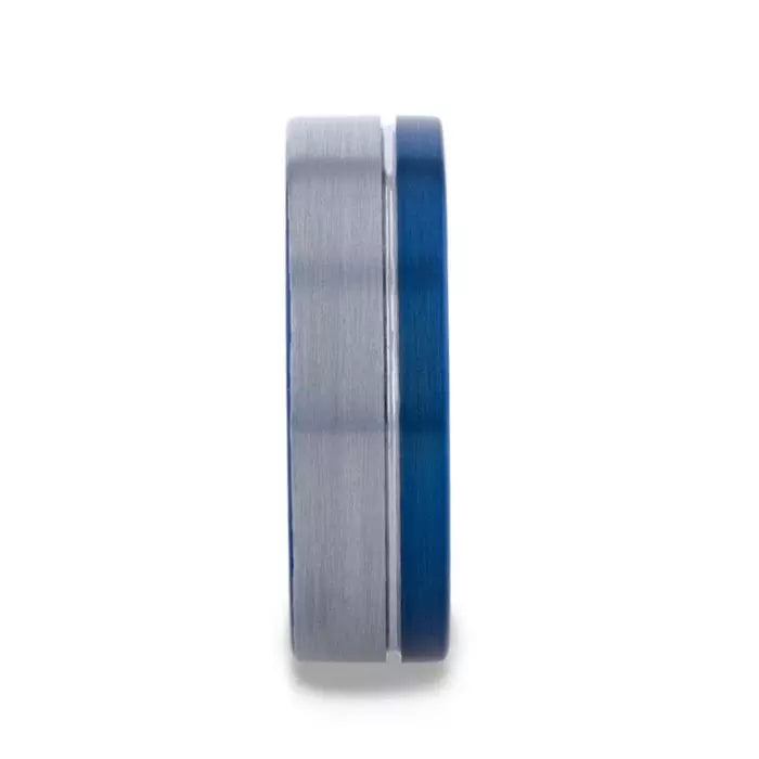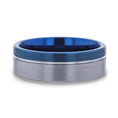 Blue & Silver Tungsten Men's Wedding Band with Asymmetrical Groove