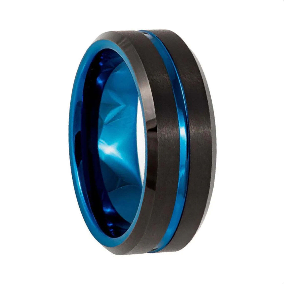 Black Tungsten Men's Wedding Band with Blue Groove & Interior