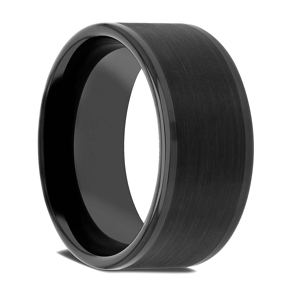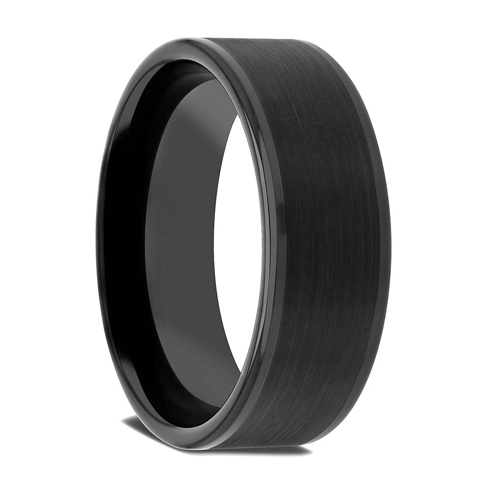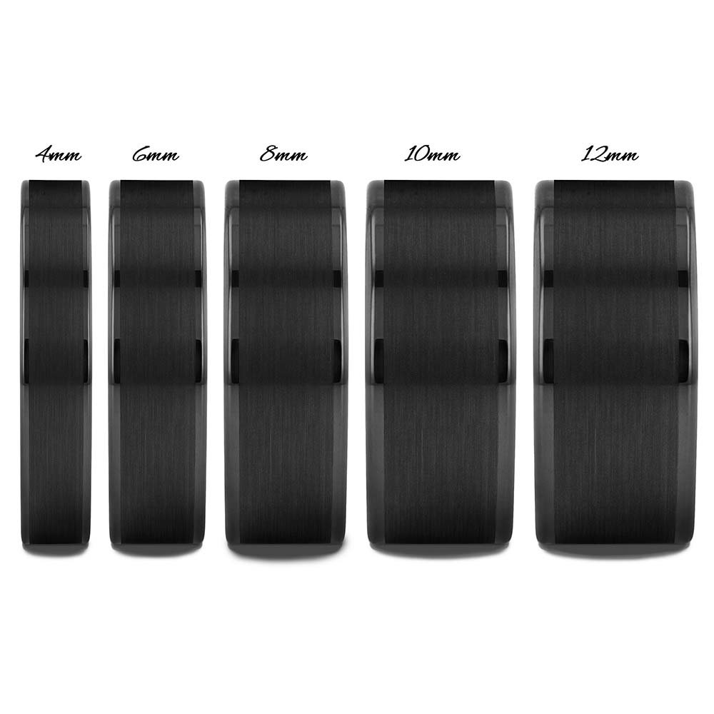 The color black is often associated with solidarity, power, strength, and certainty. It's no wonder that a black ring would signifies a person's dedication to a single individual. Like a black pebble exchanged between penguins it symbolizes the desire to mate for life. Your souls have sought one another out for a reason, and many we are guessing. Now that you've found each other, it's time for the fun part. It's time to spend a lifetime unfolding the mysteries behind the one you love while revealing the wonderful future in store for you as you walk the path together, shedding light on the beautiful pieces maybe they couldn't even see. The flat black Ceramic ring will remain as strong and beautiful upon your finger in sixty years as the day it slides perfectly into place for the first time. The brushed center against it's polished edges mark the day that two souls found themselves dancing to the same heart beat.