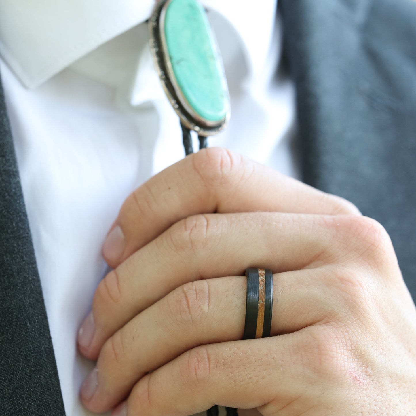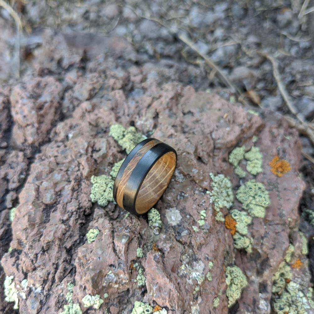 Looking for a wedding band that's as unique as your love story? Look no further than our carbon fiber and whiskey barrel wood men's wedding band! Crafted from durable materials, this ring is built to last, so you can wear it with confidence for years to come. Not only is our carbon fiber and whiskey barrel wood men's wedding band strong and sturdy, but it's also stylish and sophisticated. The warm, rich tones of the whiskey barrel wood perfectly complement the sleek, modern look of the carbon fiber, creating a ring that's both timeless and contemporary. Whether you're a whiskey-loving groom or just someone who appreciates quality craftsmanship, this wedding band is the perfect choice for you. So why settle for a boring, generic ring when you can have a one-of-a-kind piece that truly reflects your personality and style? Order your carbon fiber and whiskey barrel wood men's wedding band today and start your happily ever after in style.