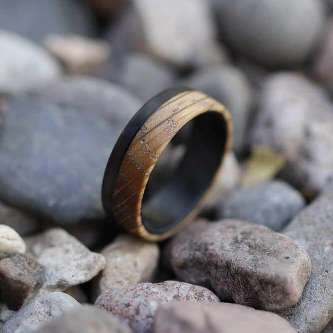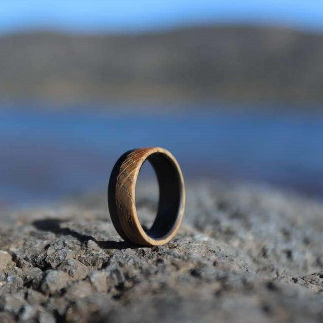 For the lovers of whiskey, whether oaky, spicy, dark, dry, or sweet, you'll be dazzled by this remarkable ring. Choosing it to show the world that you are taken bestows honor to the drink while having one cool conversation starter. The use of the treated whiskey barrel wood to make the ring add a unique attribute. In addition, carbon fiber is artfully used to reinforce the strength of the once whiskey-drenched wood. The band comes with a wood conditioner to enhance its longevity.