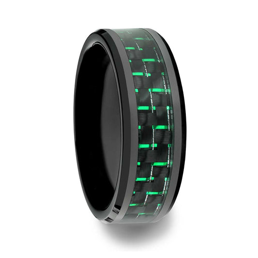 Black Ceramic Men's Wedding Band with Black & Green Carbon Fiber and Emerald
