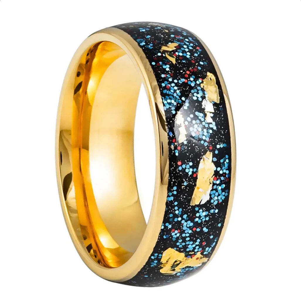 Say "I do" to the perfect wedding band! This Confetti & Gold Flake Inlay gold tungsten men's wedding band is the ideal choice for any groom who wants to make a statement on his big day while remaining affordable. Made of high-quality tungsten, this ring is built to last and can withstand even the most active lifestyles. The confetti and gold flake inlay gives the band a unique and eye-catching design that will have everyone talking. Not just for weddings, this band is also great for anniversaries, birthdays, or any special occasion. Show your love and commitment with a ring that is as strong and enduring as your relationship. Get ready to turn heads and make memories that will last a lifetime with this stunning wedding band. Get yours now.