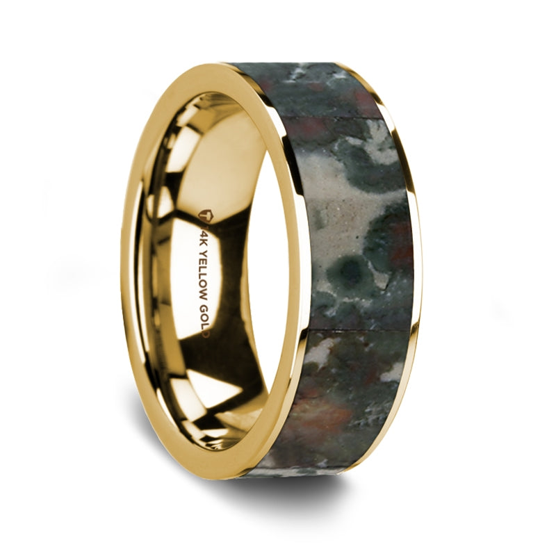 As an affirmation of love and commitment, only this magnificent ring makes sense. This vivid and outstanding wedding band with a delightful coprolite inlay is a sight to behold. It's a glistening ring that is very easy on the eye. Enter into the covenant of marriage with this piece confident that you've taken the right step and chosen the right ring for it. This statement piece upholds the appreciation and value placed on your significant other. It's truly beautiful and exceptional, deserving of a gentleman with poise, panache, and swagger. What makes this lovely ring even better is its asserted durability. You need a ring that will look glorious on your wedding and still look the same long after that unforgettable day has passed. Well, this is the perfect piece. This flat polished yellow gold wedding ring will ferry the load of all the lovely memories you make during the course of your journey and enable you to relive them throughout your life.