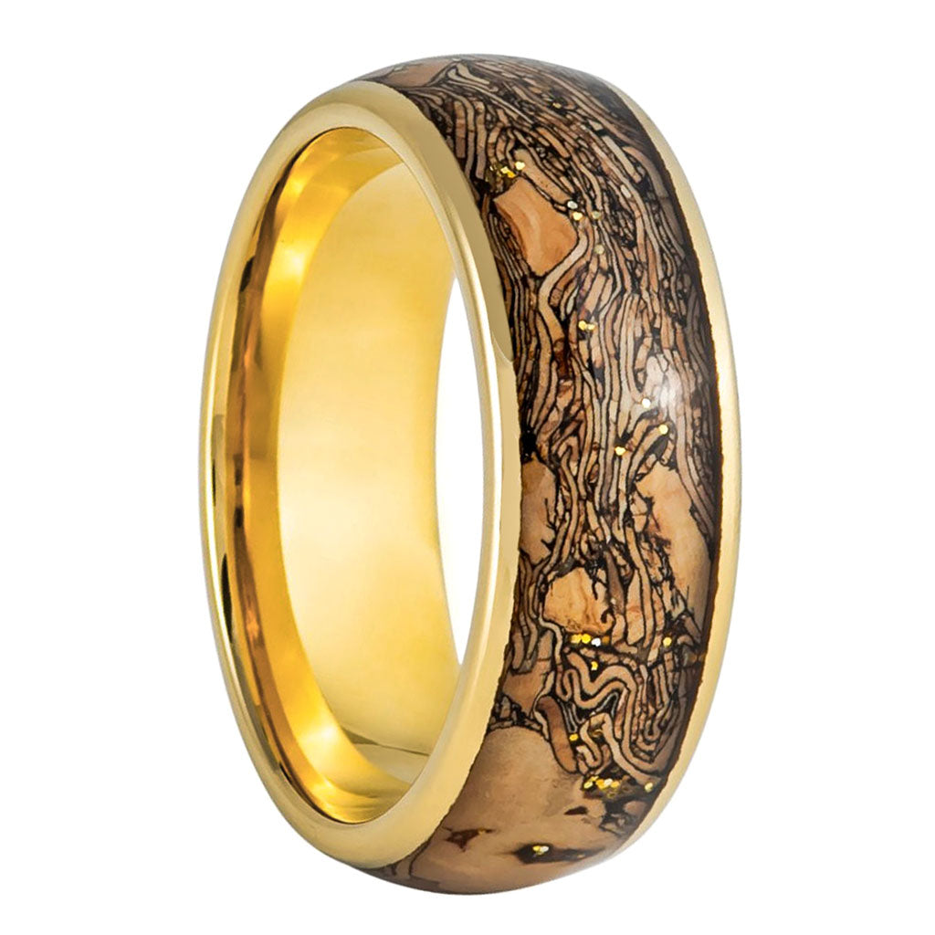 Looking for a wedding band that's both stylish and affordable? Our gold & cork inlaid gold tungsten men's wedding band is the perfect choice. The cork inlay add a unique touch that's sure to catch everyone's eye. The band is made from tungsten, which is stronger and more durable than traditional metals. The natural cork inlay is accented by gold flakes, adding subtle sparkle to the unique patterns.