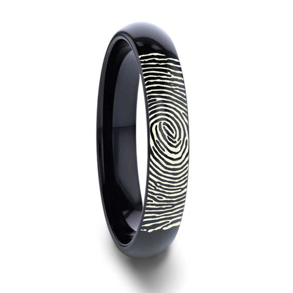 The domed black tungsten band inexplicably transforms into the subject of interesting conversations for all who lay their eyes on it. It is as though they take an unplanned detour to your hand the moment they catch a glimpse. It features an engraved custom fingerprint that instantly metamorphizes it into an ageless and classic contemporary piece. This ring magically cuts through traffic and goes straight to the divine freeway of endless memories of love. The raw and undeniable strength of this wedding ring means that it will remain in mint condition just like the day you bought it-forever remaining perfect.