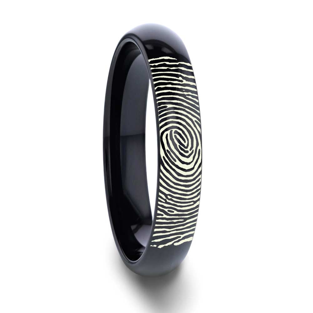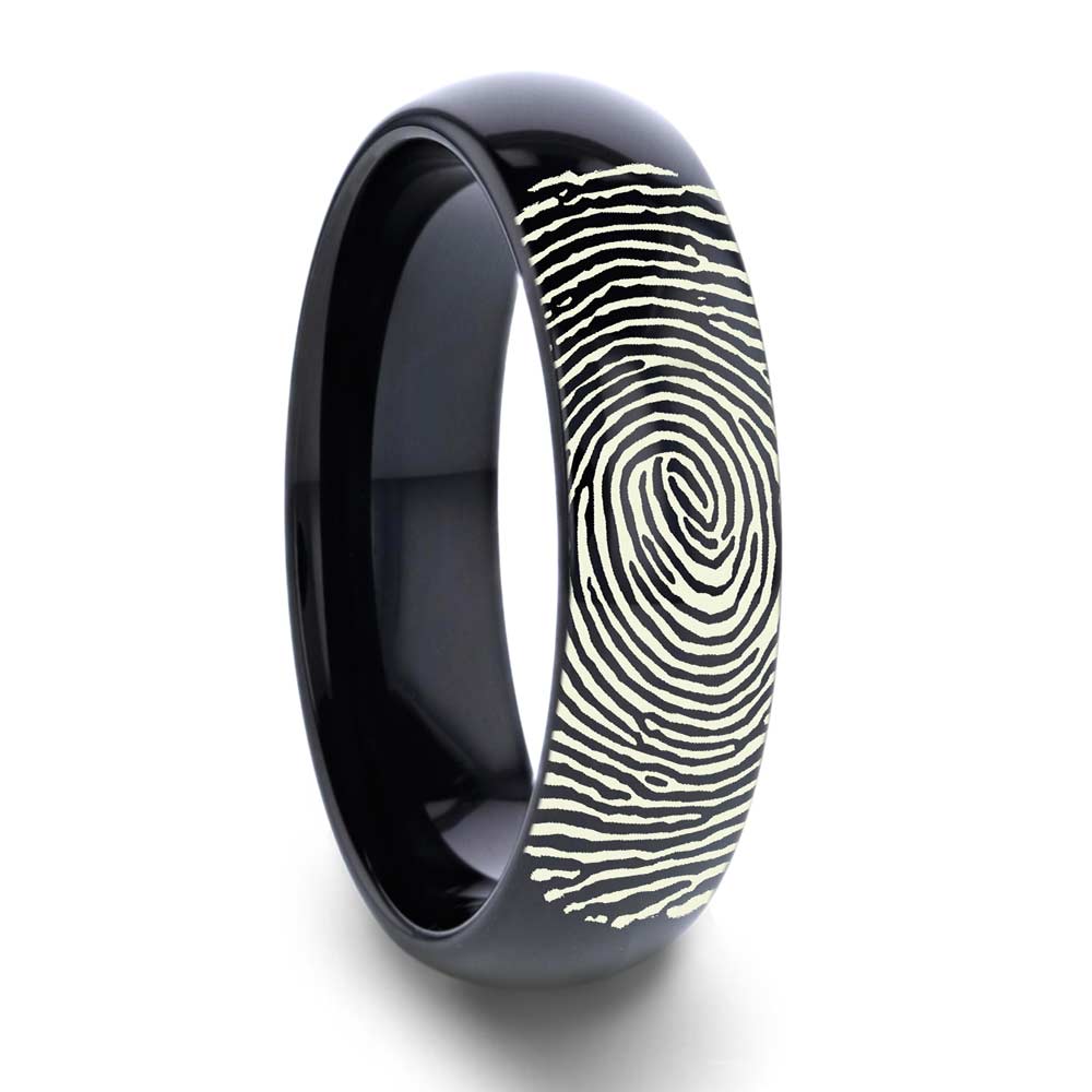 No two marriages are set just alike; the truehearted character of every individual will shine with the radiant emotion of love and matrimony in an altogether unique illumination. With that fact as a foundation, we have taken a passionate determination in the forging of just such a unique and individual figure, and this fingerprint engraved wedding band is just that. Profess your one-of-a-kind spirit, in love and in matrimony, with this smooth-domed, polished-black tungsten ring that is expertly engraved with that ultimate uniqueness, that true one and only: your loving partner's very fingerprint. There can never be another.