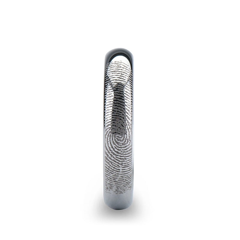 Add your own unique fingerprint to this 100% unique fingerprint wedding band. Your ring will be engraved with the your exact fingerprint. Select the free stamp pad option during checkout to receive a black stamp pad in the mail that you can use to create your fingerprint images. This domed tungsten band is for those who desire a look that is not only bold but also strong, classy and sophisticated. This amazing creation features an engraved custom fingerprint and a dazzling polished finish commanding a plethora of non-stop attention. This is one resolute piece that defines the status for today's gentleman. Best of all, this piece is the ideal high velocity declaration of your fiery true love. Just like your beloved, this ring is a prized possession that you will revere endlessly. Its contemporary appearance will always remain no matter the season or year. It is perfect for both the young and the forever young at heart.