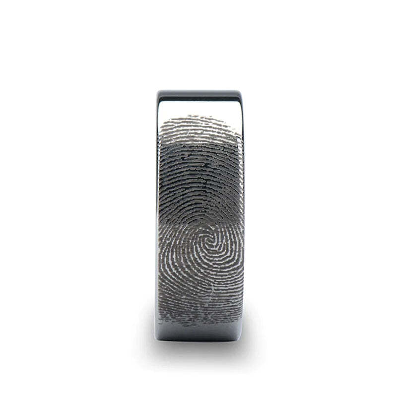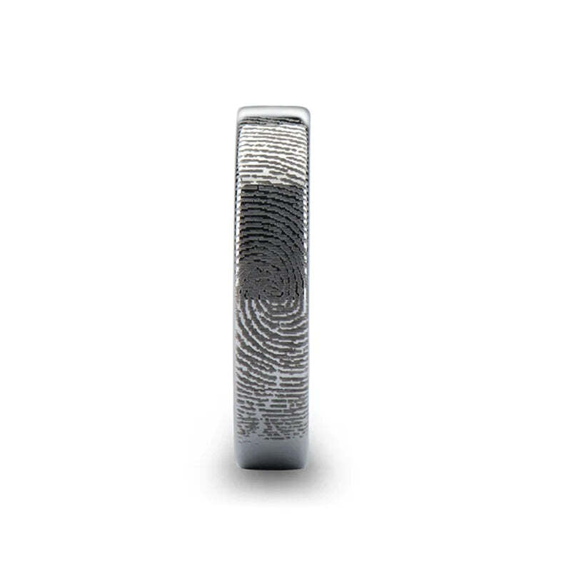 This wedding band will be engraved with your own unique fingerprint. When you order, please follow the instructions here so we can customize your ring just for you. You may choose to upload your fingerprints when you order, email them at a later time, or wait for us to get in touch with you with directions after you order. A $50 customized engraving fee is included in the price.