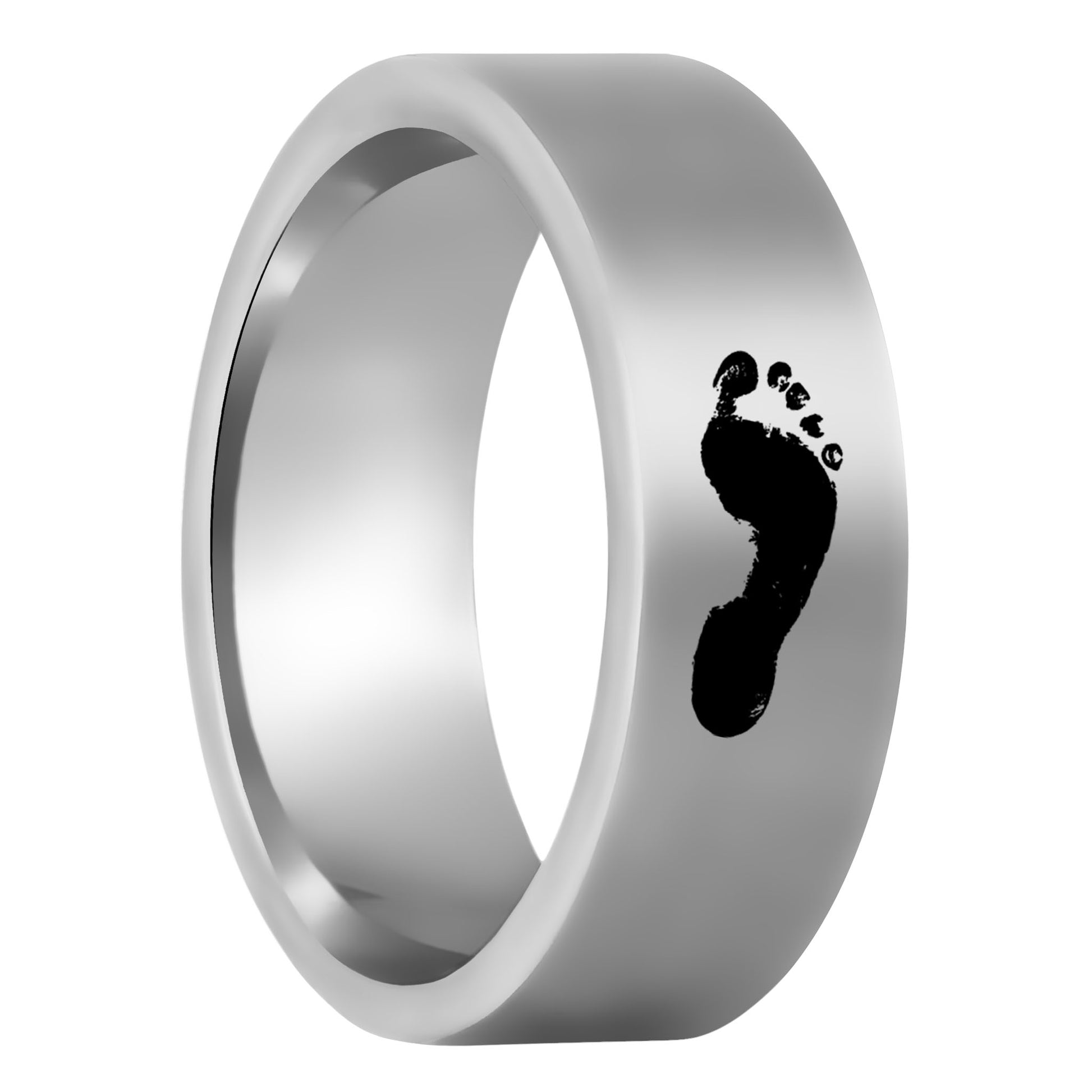 As a gentleman who likes a minimalist look, this is the ideal wedding ring for you. This piece is simple, and at the same time, strikingly noticeable. The footprint engraved on the exterior is black, contrasting well with the brushed silver appearance of the ring. It's the perfect way to add sophistication to your wardrobe without trying too hard. This chic look will last for many years as the nuptial band is made from tungsten, a hard metal that does not break easily, and is scratch resistant. The engraving itself is symbolic of the step that you're taking into marriage life. This makes the ring a perfect way to remind yourself of the day you became united with the love of your life. It's a reminder that you're now experiencing life with the person you want to spend the rest of your life with. Let it represent all the steps you're going to take together as a couple, as you create memories to last a lifetime.