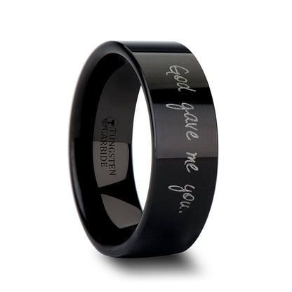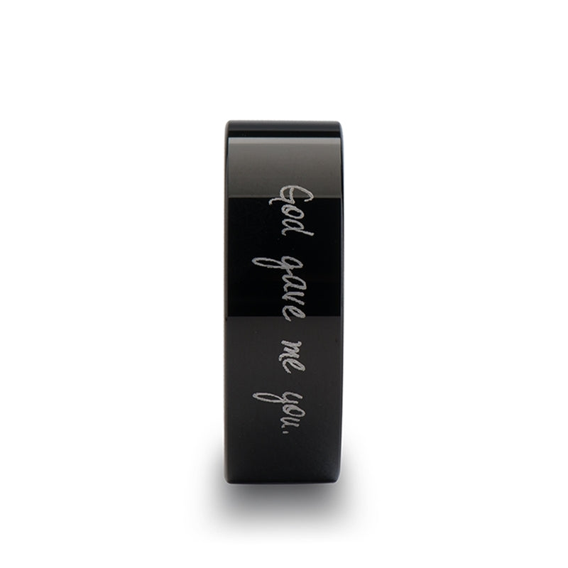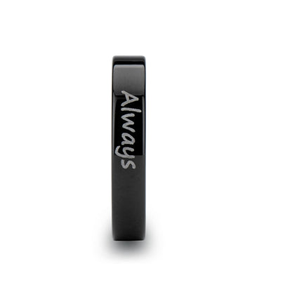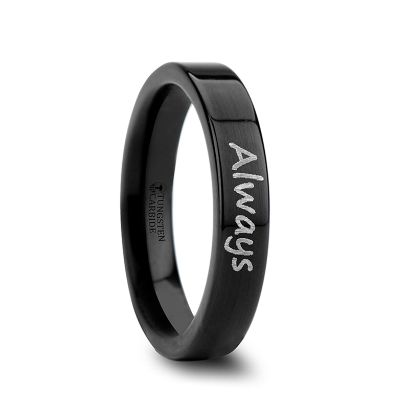 I will always want to see you first thing in the morning, I will always want to be responsible for that little laugh I love so much. I will always remember the little things you do. I will always be grateful for you. That is one of the many promises whispered into the black polished Tungsten carbide of this particular wedding band. Always is an infinite word used to define an endlessness that you both hold within your heart for one another. Let this brazen Tungsten carbide ring relay that message to the world around you while reflecting the infinity of reasons back to you.