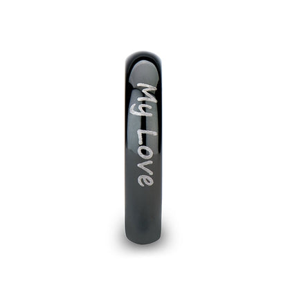 The glossy finish to this wedding band is broken only by the resounding echo of your proclaimed love for the one you wear it for. May this domed black tungsten carbide ring always remind you of the special place you hold in your heart for the one who's earned the custom handwriting engraved name etched into the perfectly polished surface, immune to all other blemishes thanks to the steadfast material it is made from. Get ready to say "I do" with a wedding ring that's as unique as your love story! Our custom handwriting engraved domed black tungsten women's wedding band is the perfect way to express your commitment to each other. This ring is made of high-quality tungsten that's scratch-resistant and durable enough to last a lifetime. And with our lifetime warranty, you never have to worry about damage or size exchanges. Our skilled artisans will take your handwritten note and engrave it onto the ring, creating a one-of-a-kind masterpiece that you'll treasure forever. It's a beautiful way to keep your loved one close to your heart, even when you're apart.